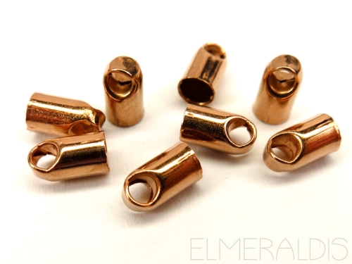 Endkappen – Endteile – Terminals – Clasps Form: rund mit geschlossenen stabilen Ösen Größe: ca. 3 mm x 5 mm (incl. Öse) Innendurchmesser: ca. 2 mm Öse innen: ca. 1,5 mm Menge: 10 Stück Farbe: rosegold glänzend Material: Metall, Herkunft EU